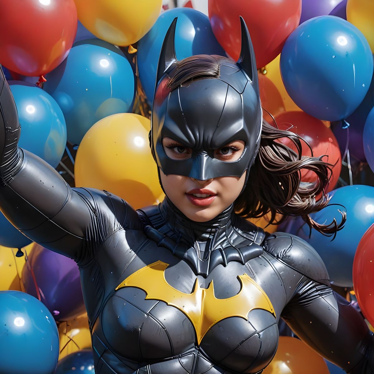This image depicts a muscular Korean woman in a Batman-inspired rubber suit. She is surrounded by balloons and flexing her biceps.