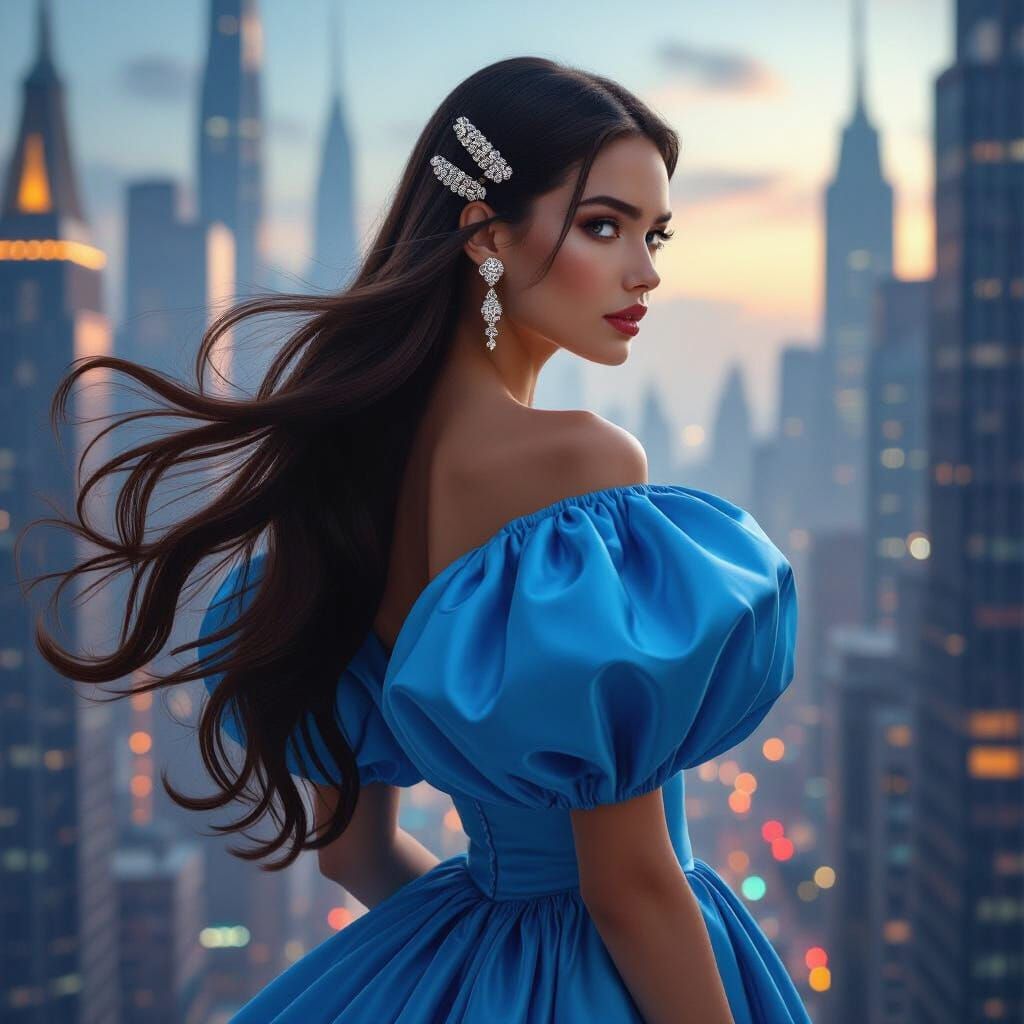 This image shows an elegant woman with flowing hair and diamond clips in a cosmic city. She wears a blue mini dress with puffy sleeves. The image is a photorealistic blend of haute couture and art nouveau.