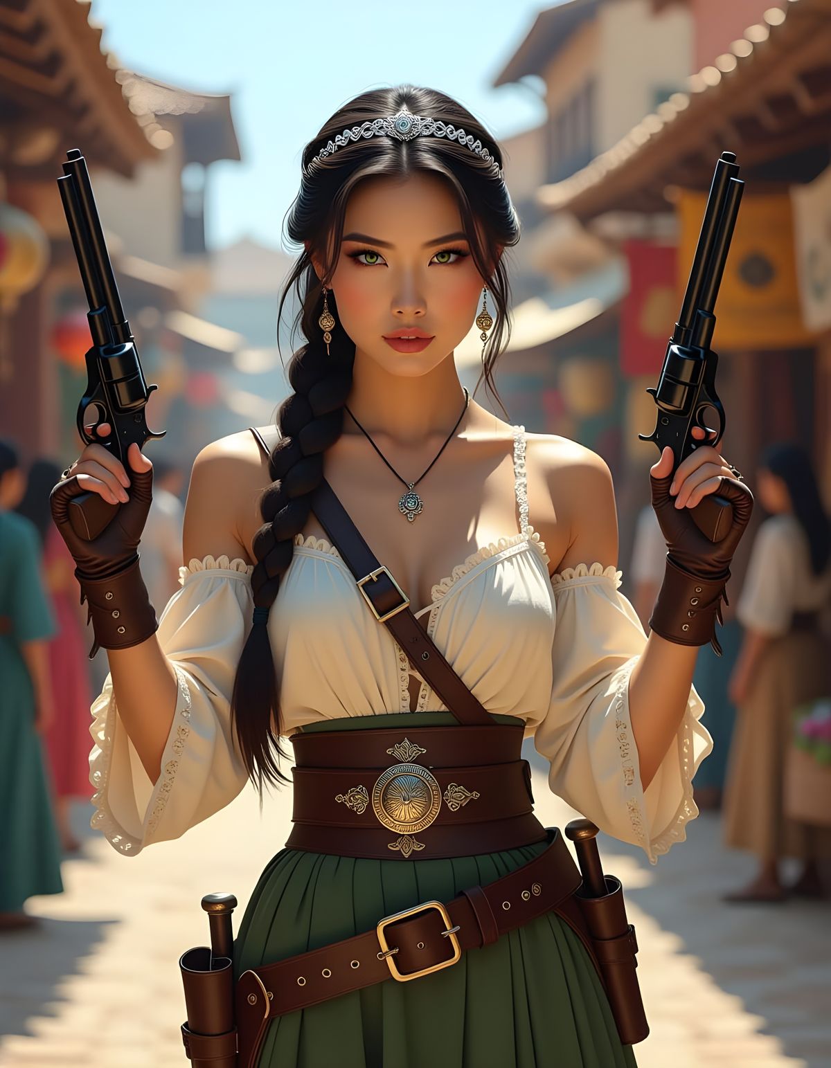 A full-length portrait of an Asian gunslinger woman with green eyes and blond braided hair, wearing a silver headband and holding two revolvers in a medieval town market.