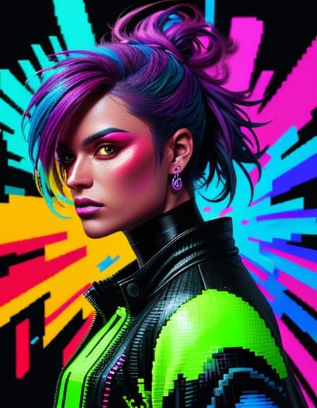 This image shows a person viewing a scene filled with vibrant colors and abstract elements. Rendered in a pixel art style, the image features neon lights and dynamic lighting to create a dreamlike aesthetic.