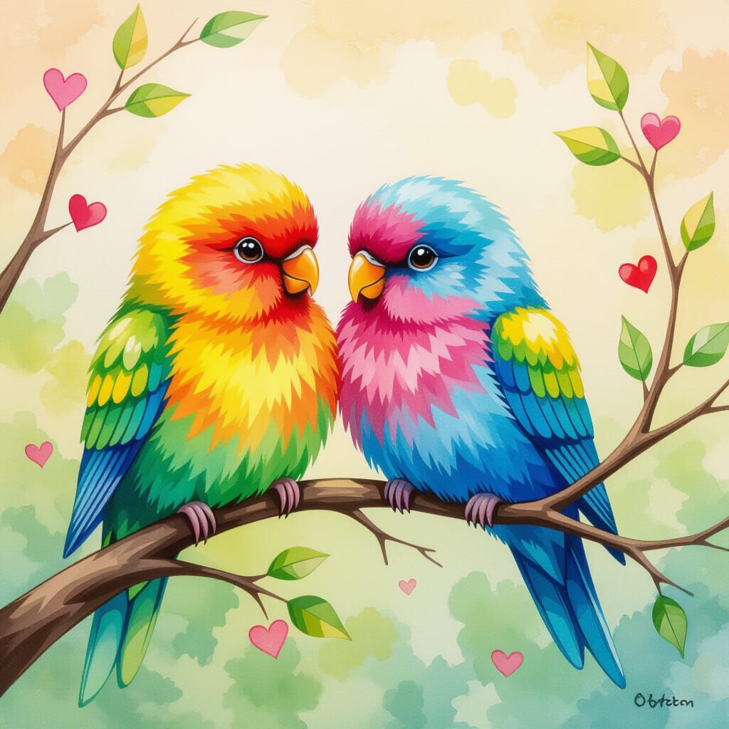 This image shows vibrant, fluffy lovebirds perched on a tree branch. It is rendered in a whimsical and surreal artistic style, reminiscent of oil on canvas and watercolor techniques.