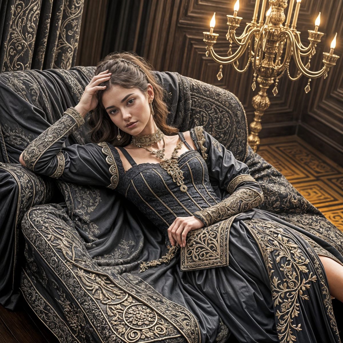 A hyperrealistic image shows a Damascus dagger with a gleaming blade and gemstone-inlaid handle. It rests on a velvet cushion amid ornate jewelry, with dramatic lighting reminiscent of Baroque painting.