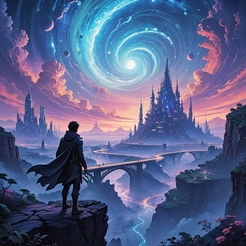 A surreal manga painting of a lone adventurer viewing a glowing alien city from a precipice. Bioluminescent flora and vibrant nebulae illuminate the detailed architecture in auroracore style.