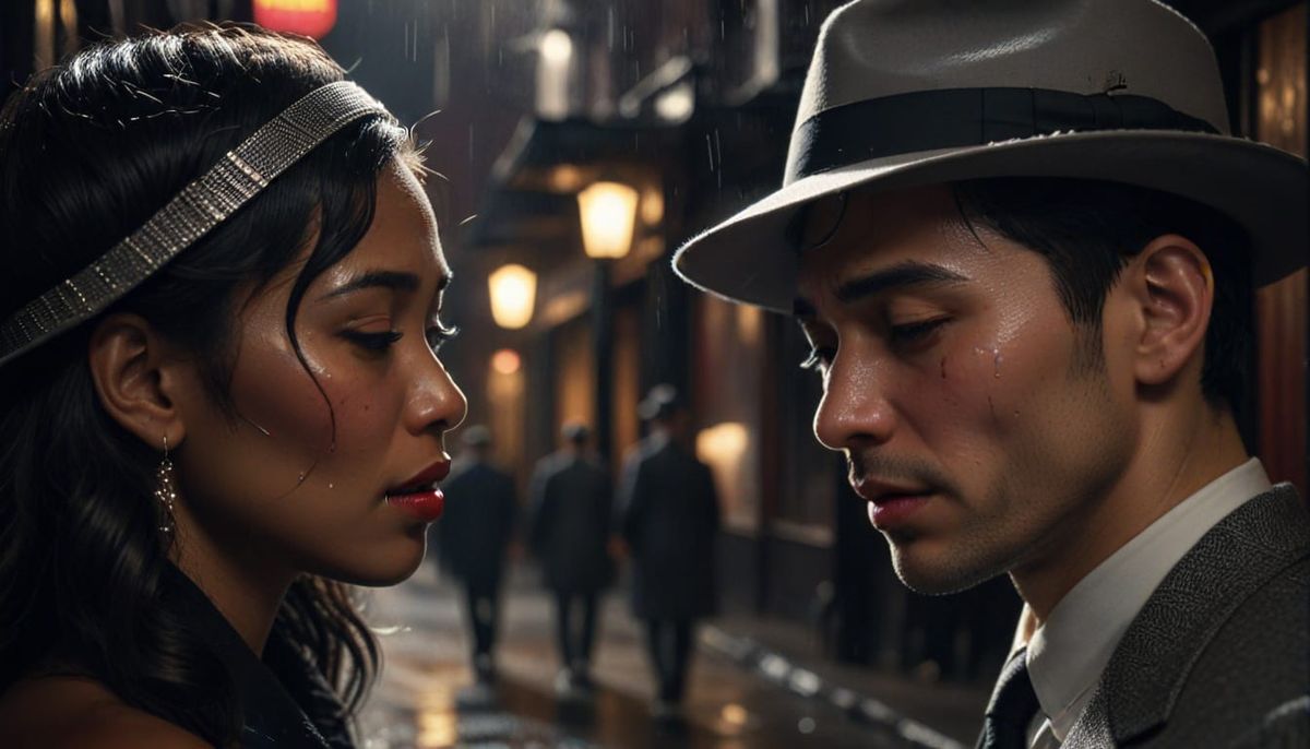 close-up of a sopping wet dark-skinned Black woman holding back tears on the left side of the image leaning towards an Asian man wearing a fedora who is similarly crying, the background is set in a dimly lit street outside a 1920s New York speakeasy, ominous lighting, cinematic lighting, deep shadows, ...