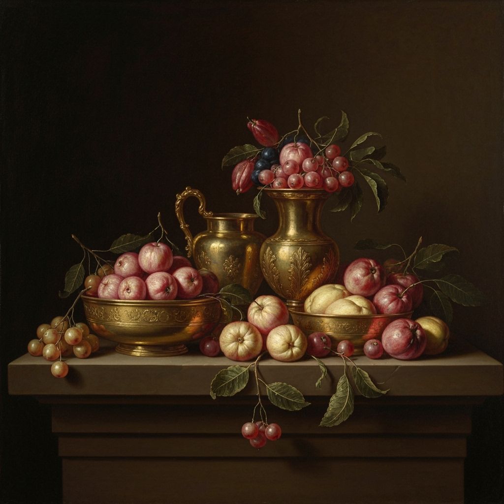 This image showcases a Baroque still life featuring exotic fruits and golden vessels. It uses a meticulous realistic technique with rich burgundy and gold colors, creating an opulent mood.