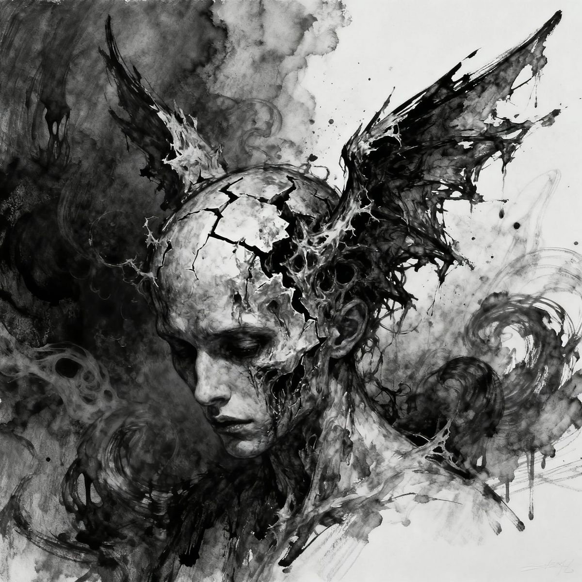 This image depicts abstract chaos and madness within a dark surrealist style, evoking horror and doom through soft painting techniques.