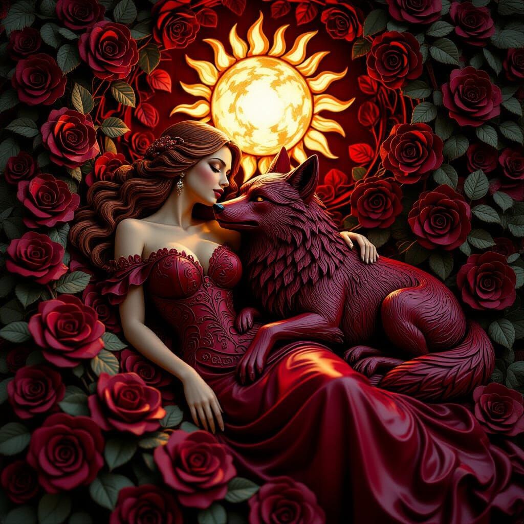 This image depicts a woman and a wolf, both intricately carved from wine red wood, resting in a matching rose garden under a carved wooden sun. Features detailed textures and warm lighting, evoking fantasy realism.