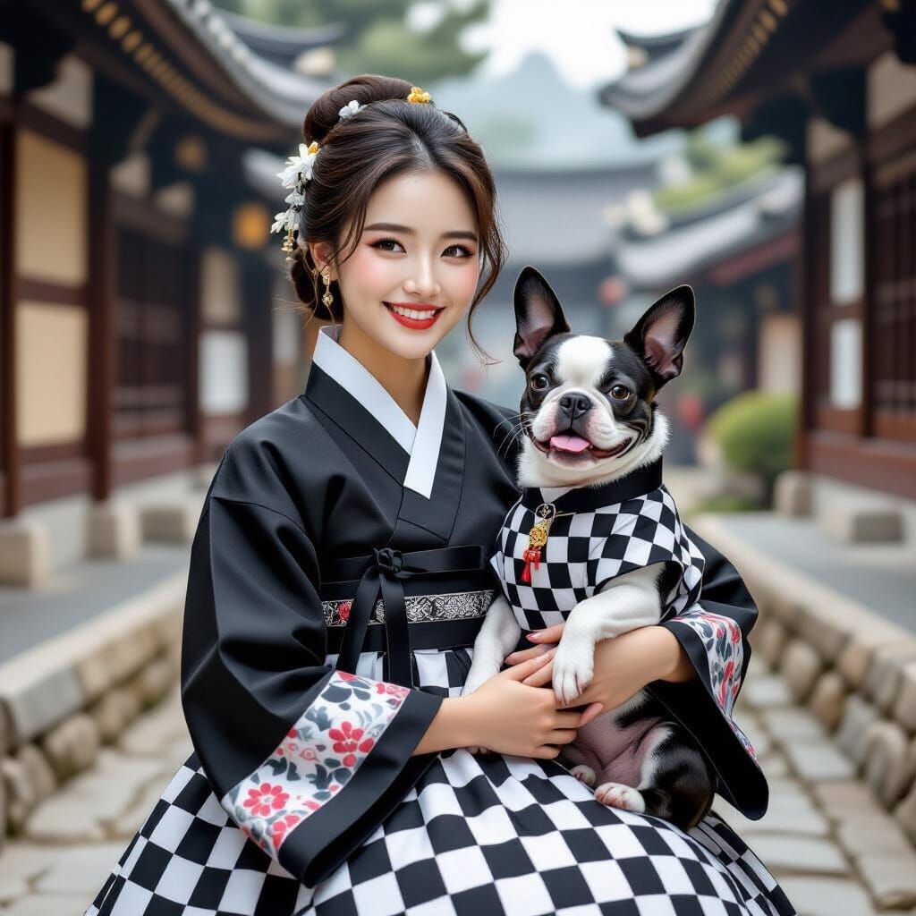 This image shows a Korean woman and her Boston Terrier in matching hanboks, both smiling in a traditional courtyard. The hyperrealistic image is rich with intricate details and vibrant colors.
