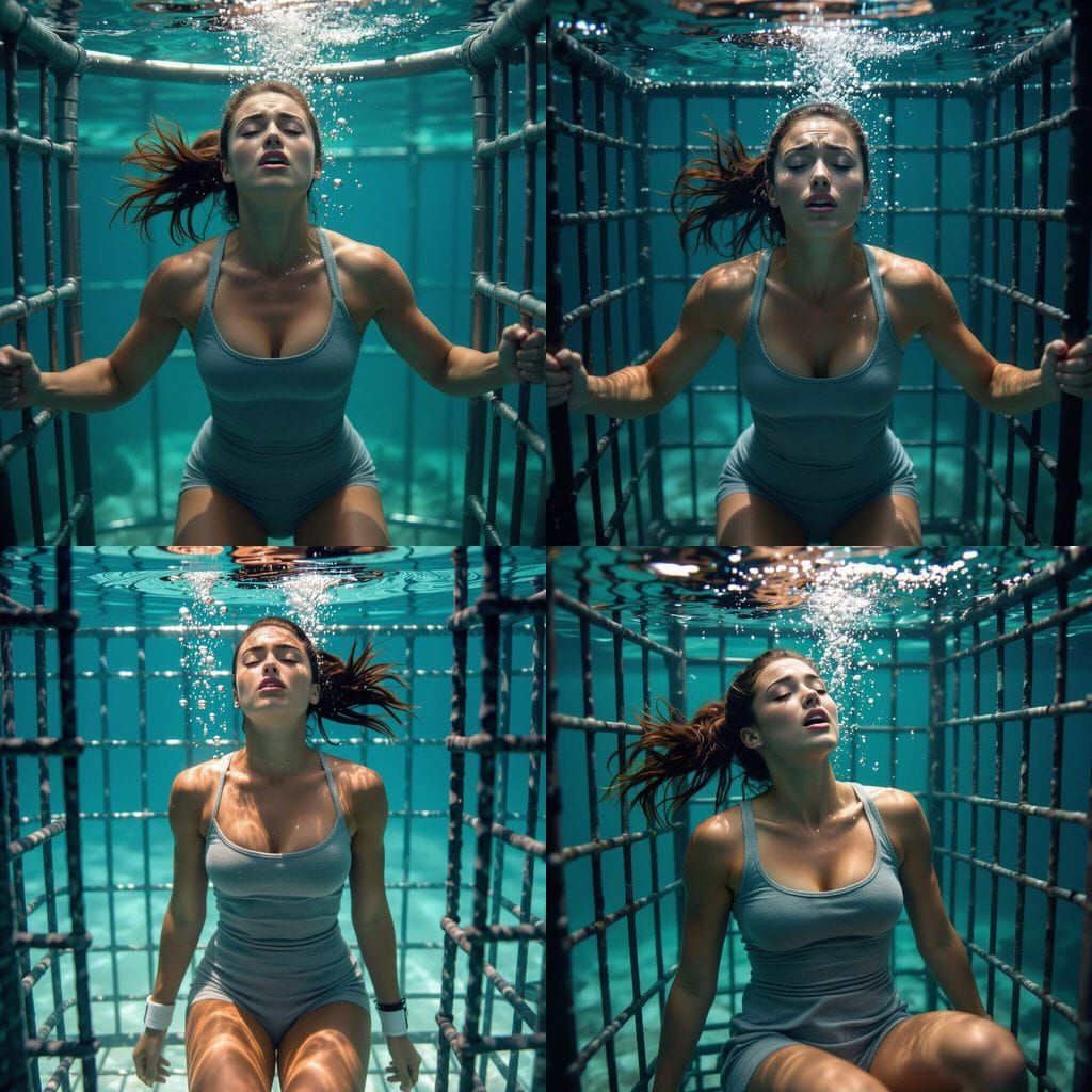 Cinematic film still of a muscular woman with a ponytail, wearing a grey minidress and converse, trapped in an underwater cage. Her face shows pain as she drowns, with air bubbles escaping.