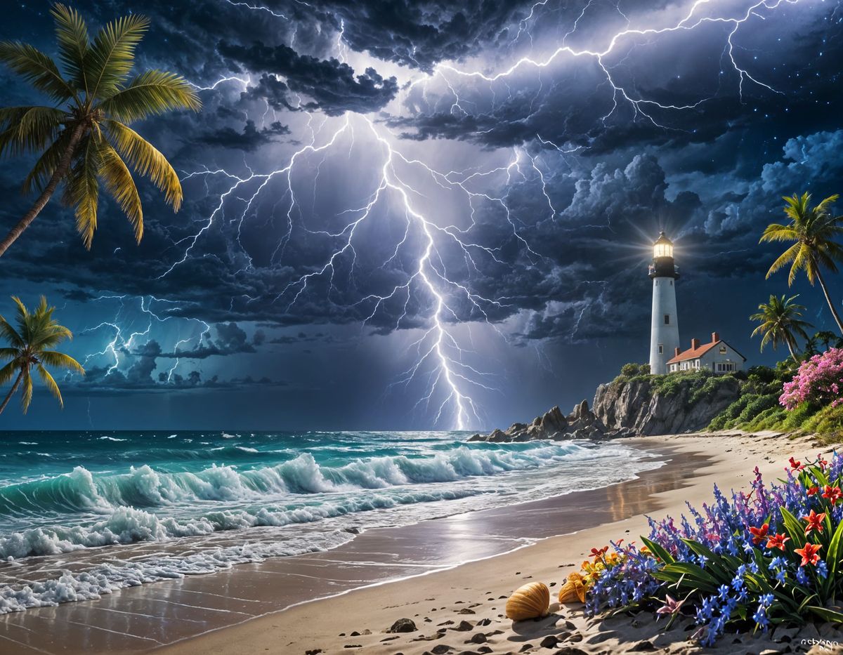A vibrant image displays a beach under a moonlit sky with lightning. Waves crash near flowers and palm trees, with holographic light and a distant lighthouse. Rendered with hyperrealistic detail.