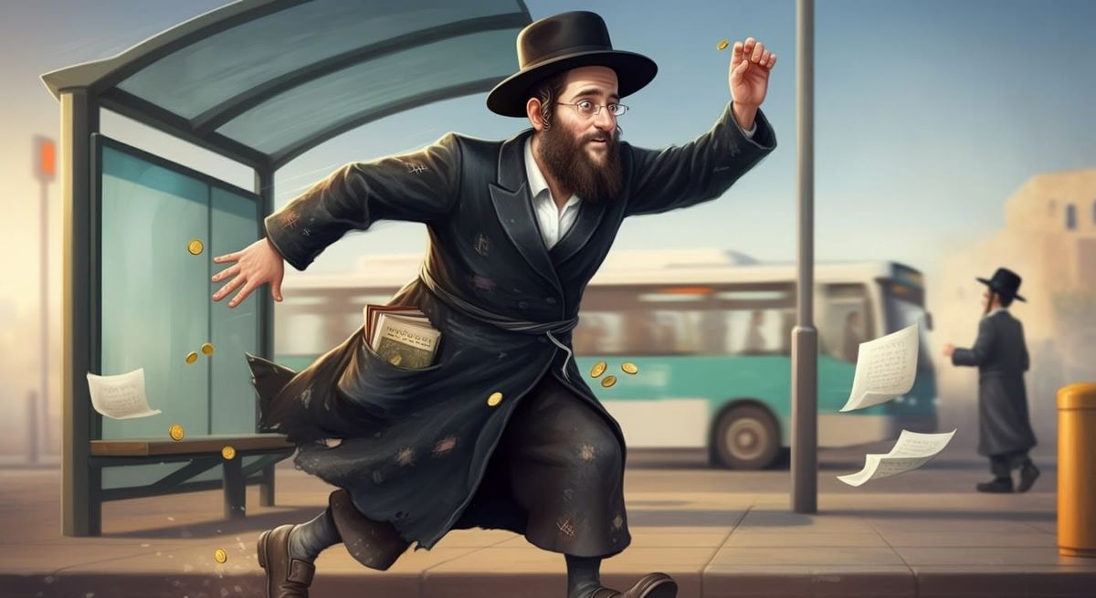 This image shows an Orthodox Jewish man rushing to catch a bus. Clad in traditional attire, his worn clothing and bulging pockets suggest a humble scholar in a realistic comic art style.