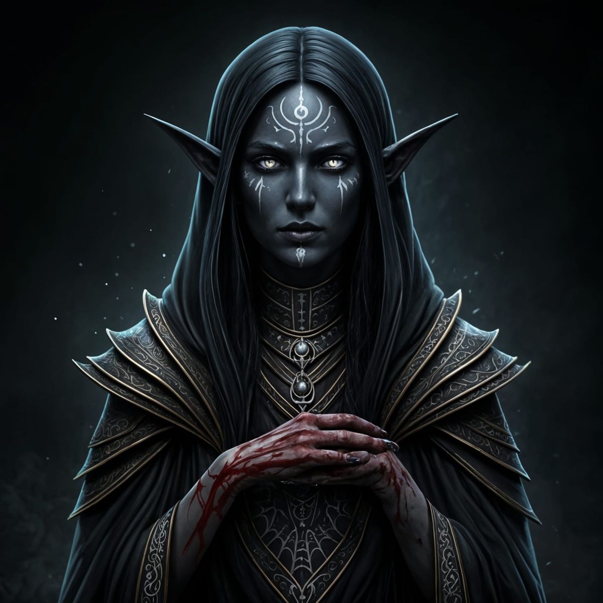 This image shows a dark elf priestess in ritual attire, her face conveying inner turmoil. Her hands are stained with ceremonial markings, and she is surrounded by a faint aura.