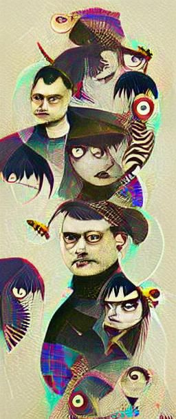 A digital illustration of the band Gorillaz in a Victorian Goth aesthetic. The image blends elements of Genndy Tartakovsky's animation style and Junji Ito's horror manga with Kandinsky's abstract art.