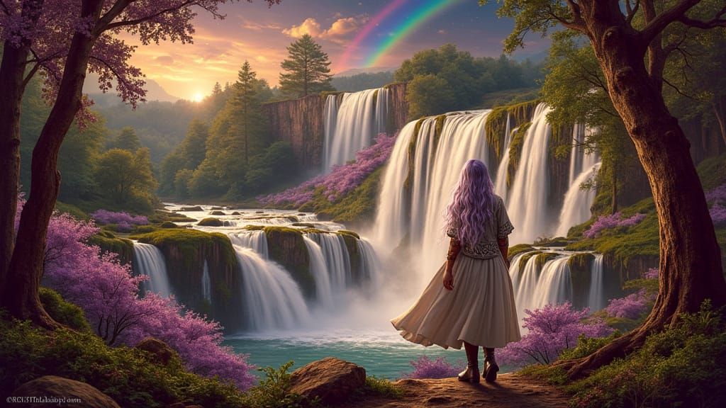 A digital painting of a woman with iridescent hair at a forest's edge. She wears leather and stands near a waterfall under a sunset sky with stars, rendered with a dreamy aesthetic.