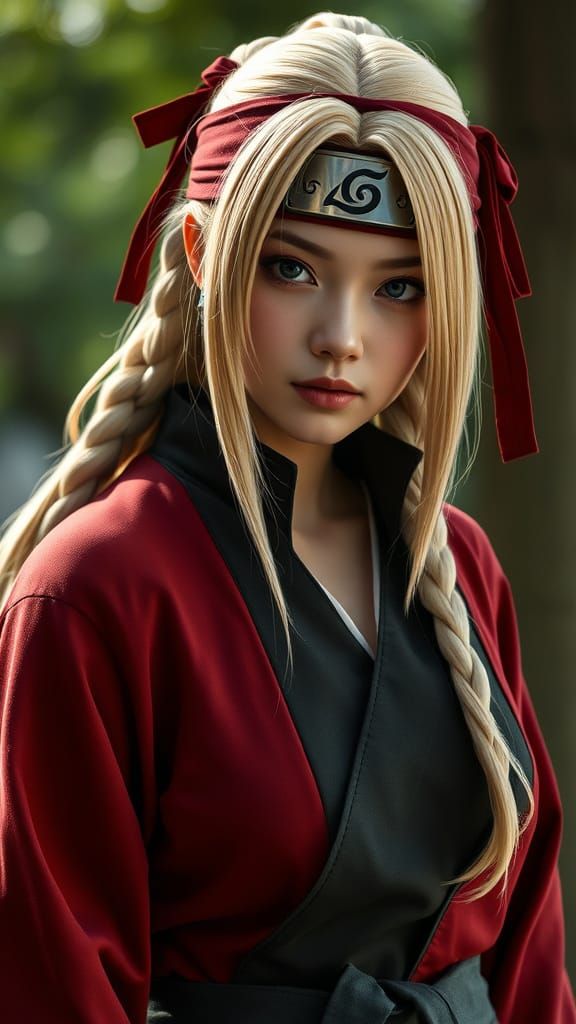 This image shows a photorealistic portrait of Tsunade from Naruto as the Fifth Hokage. The character is presented with original details, captured in a professional photograph with natural lighting and a bokeh effect.