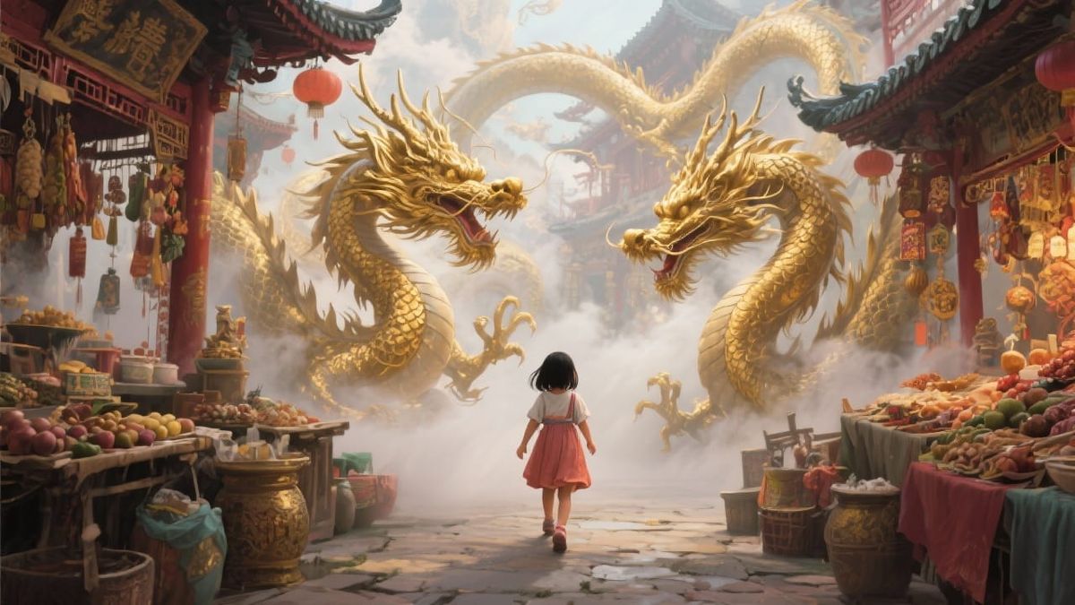 Generate your own magical Asian market images with golden dragons. Free and easy AI image creation.