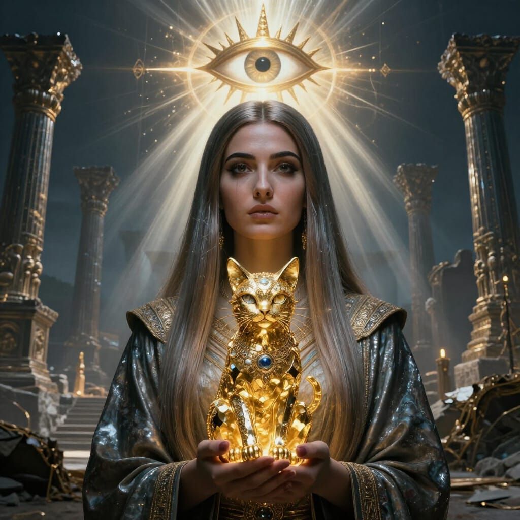 michelangelo painting style : beautiful soft armenian woman with ultra straight air holding gold crystal cat with open third eye, she looks intrigued, very connected spiritual, ruins of shamballah in background, third eye chakra,, ray of lights between characters, ultra deep contrast, large scene composition, ...