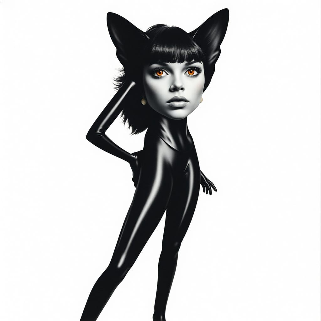 This image is a dynamic black and white representation of a woman in a bright orange catsuit, characteristic of the op art style popular in the 1970s.