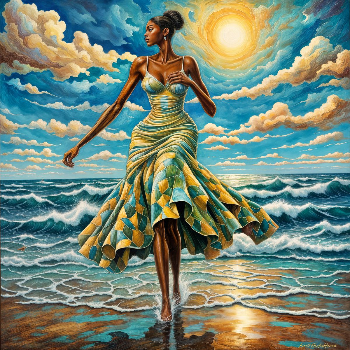 This image shows a graceful woman runs from the sea on a shoreline, embodying freedom. Her dress merges with the ocean in an expressionist style, reminiscent of 19th-century American realist oil paintings.
