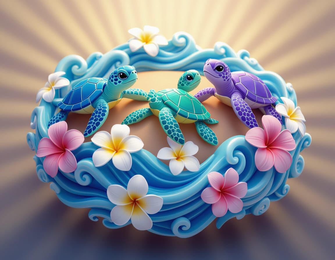 This image shows a wrist tattoo design featuring ocean waves and sea turtles. Plumeria and hibiscus flowers add color in a vibrant, 3D rendered style reminiscent of Pixar concept art.