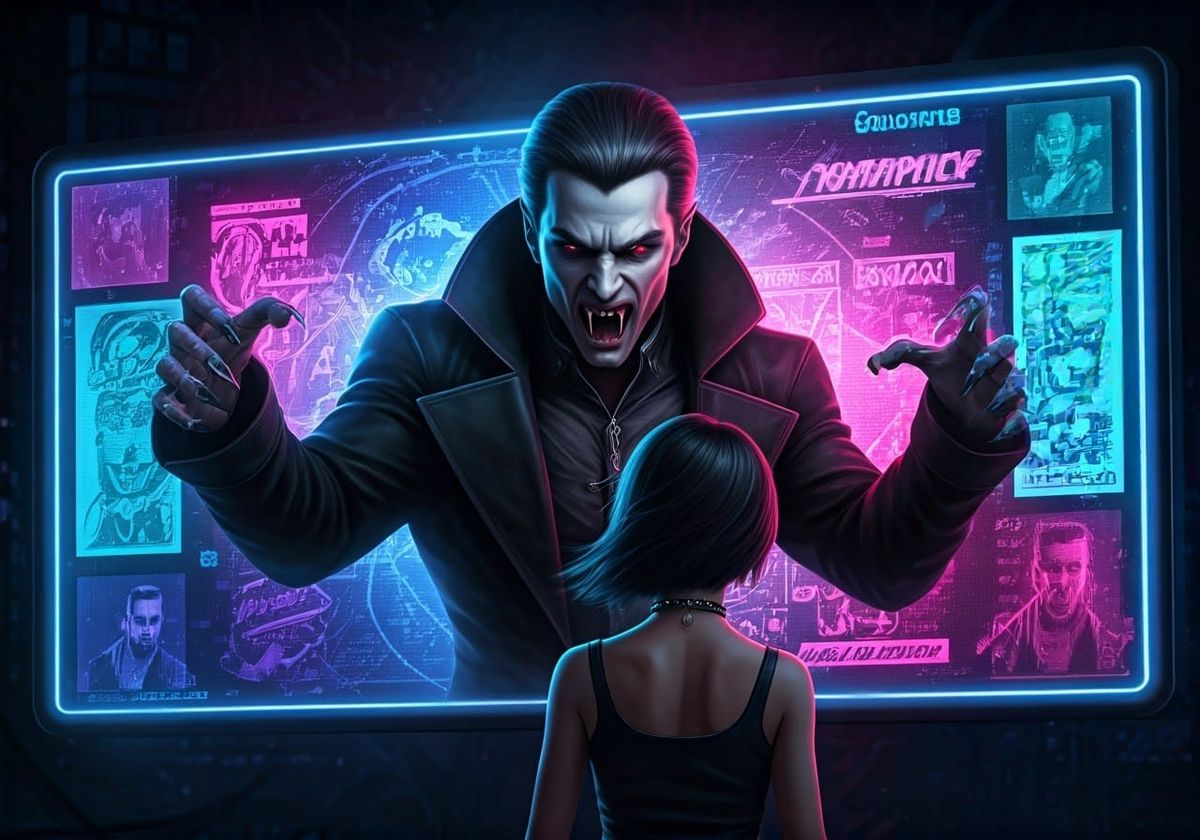 A dark and menacing cyberpunk vampire emerges from a futuristic digital screen, looming over a unsuspecting young woman in a dystopian urban environment, illuminated by vibrant neon lights and eerie digital advertisements.
