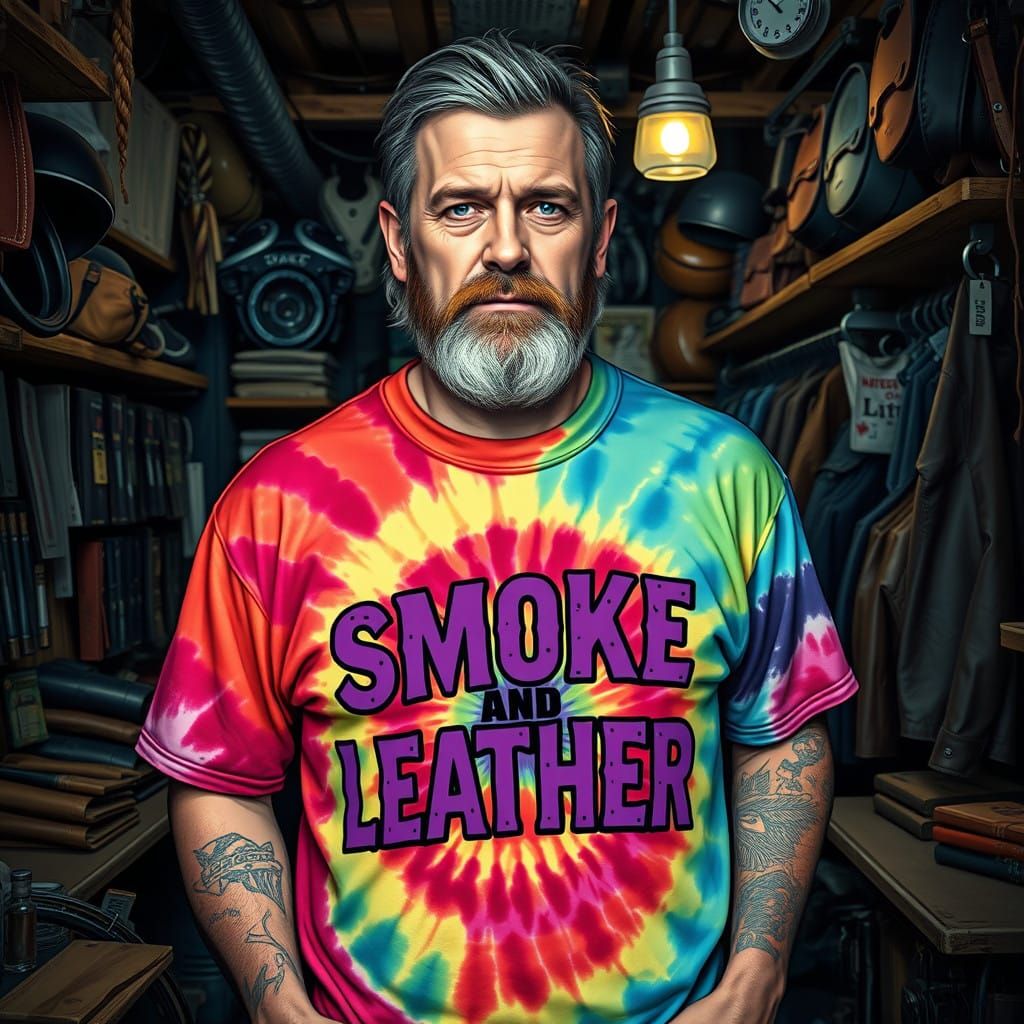 A biker stands in his dimly lit shop wearing a rainbow tie-dye t-shirt with "Smoke and Leather" in bold font. The image blends realism with graphic novel textures.