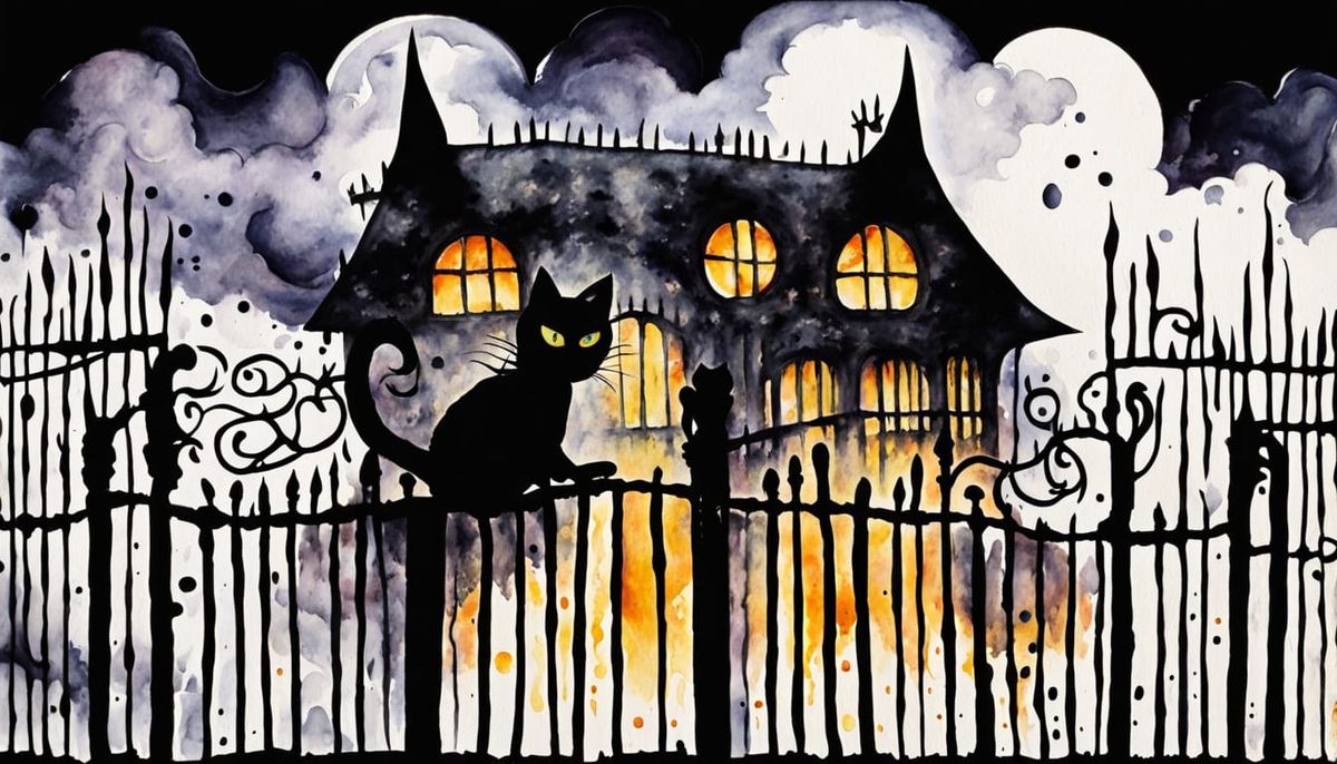 A striking picture of a black cat with glowing eyes guarding a haunted house behind a black fence. Rendered as a watercolor painting with swirling clouds and ornate details.