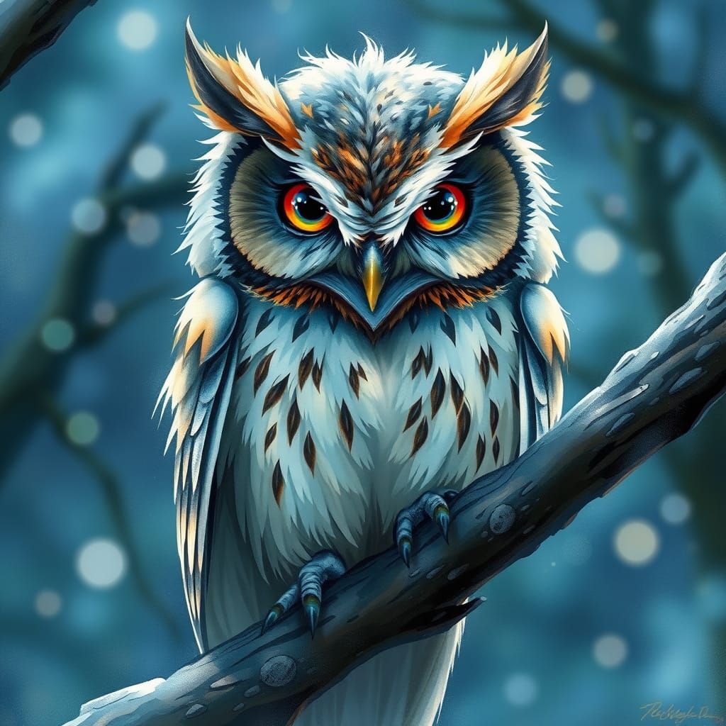 This image showcases a majestic owl with intense eyes perched on a branch, painted with flowing watercolor techniques and cool colors. It evokes a dreamlike, magical realism atmosphere.