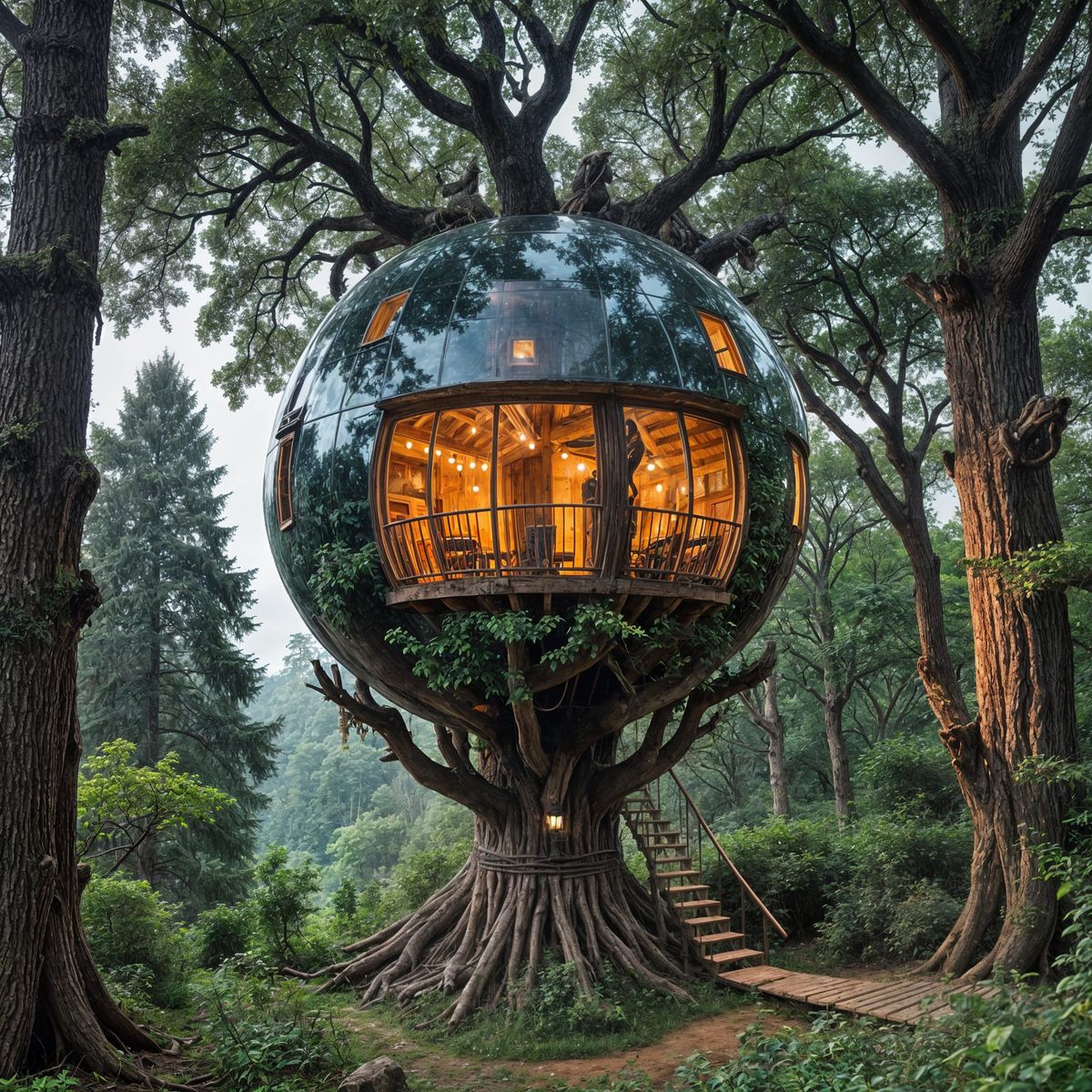This AI-generated image depicts a mystical Forrest King demon residing within an extraordinary globe-shaped treehouse.