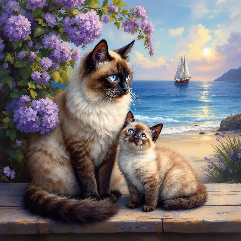 This is a highly detailed oil painting of a Siamese cat and her kitten sitting on a bench with a beach ocean view, a sail ship, and purple flowers.