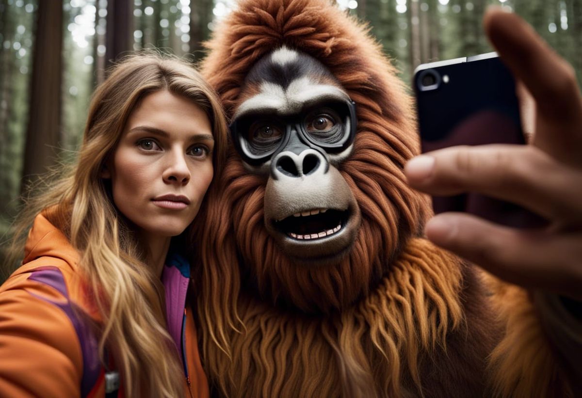 A color portrait of a young woman in sportswear taking a selfie with a furry Bigfoot. The shot features studio lighting and a shallow depth of field, reminiscent of professional portrait photography.