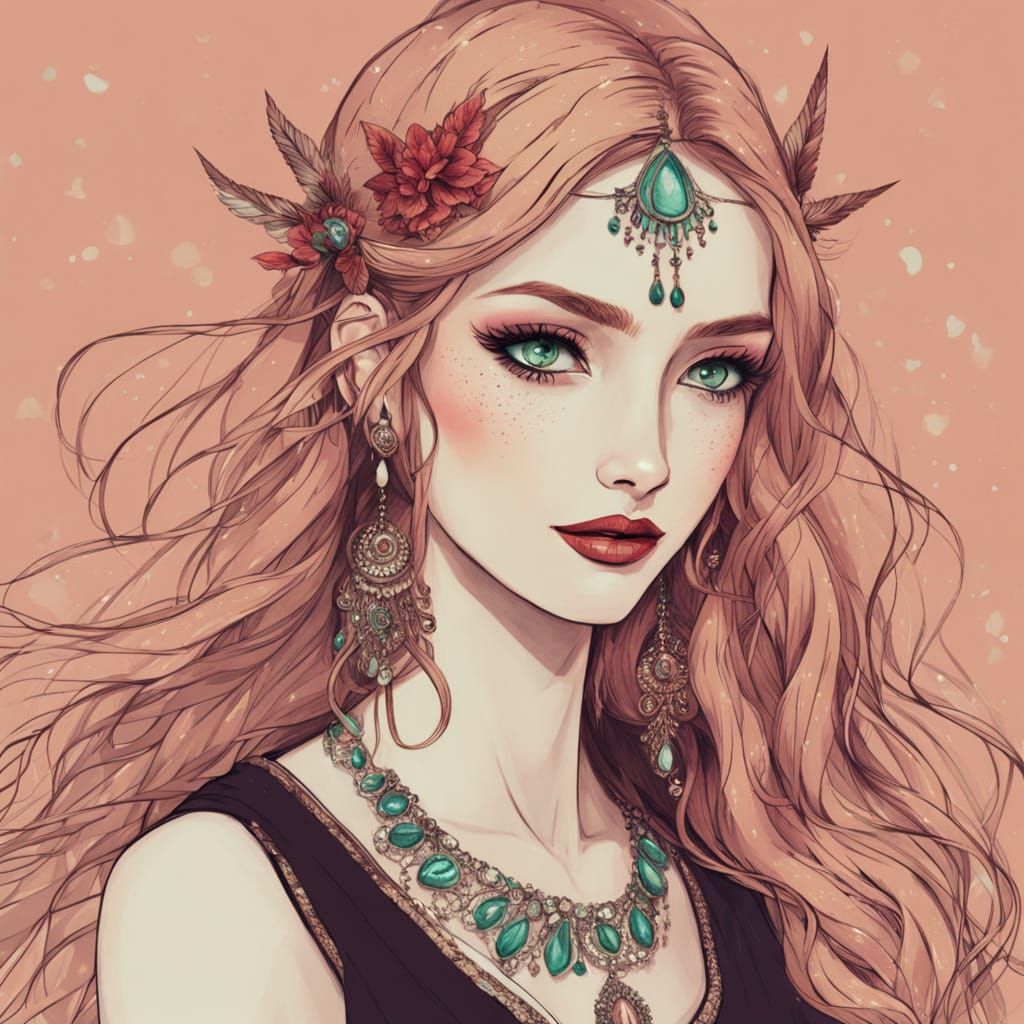 This image showcases a stunning, animated woman with long, soft curls and a warm, golden complexion. Her features are highlighted by natural light, emphasizing her full lips and striking green eyes. A true embodiment of the Fairie Chic aesthetic.