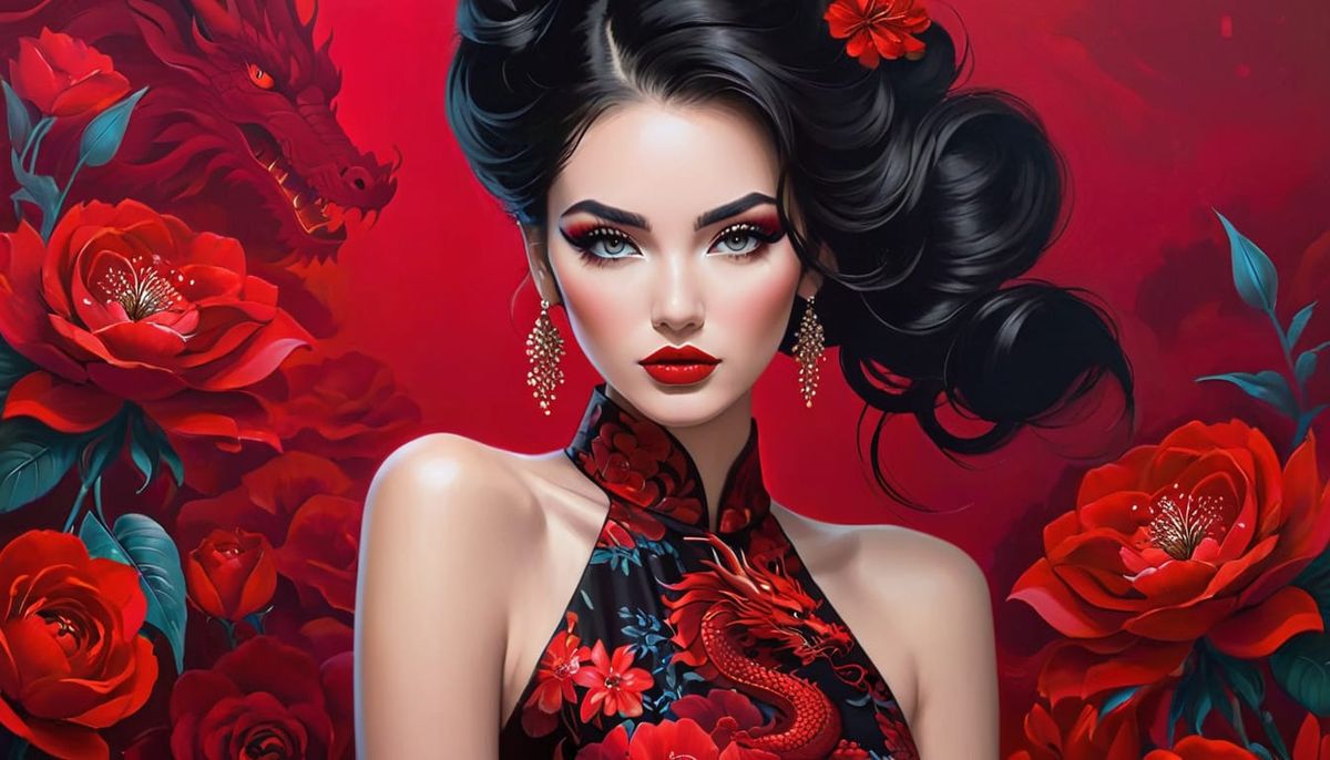 A striking picture of a woman with dark hair and a red flower. She wears a red dress and has a floral dragon tattoo. The background is a glitch-core aesthetic.