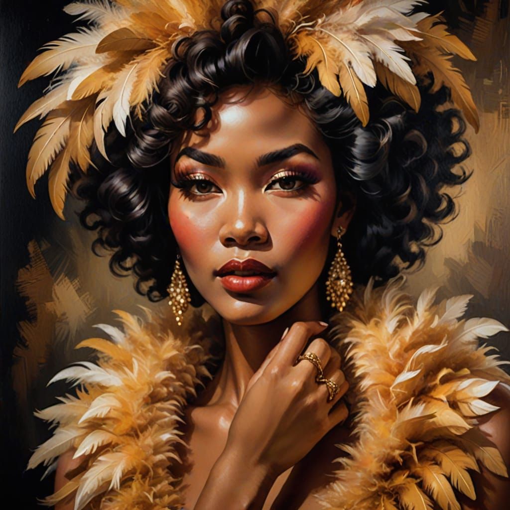 This image shows a stunning Afro-Asian woman in a feather boa gently touching her face. The oil painting style features a soft glow, painterly textures, and warm, golden light.
