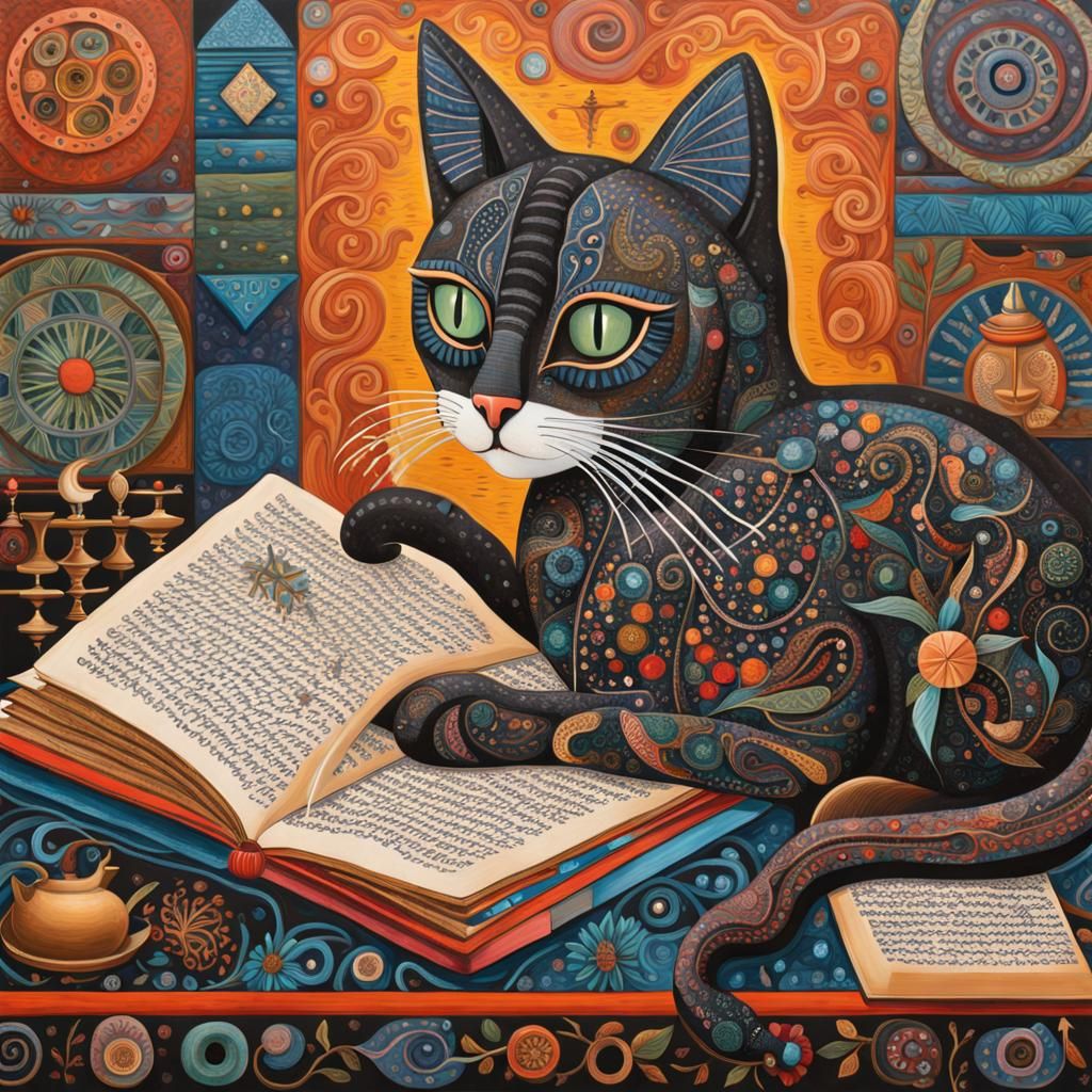 A vibrant, whimsical 3D image of a cat engrossed in writing a book. The artwork features intricate details and a colorful palette, reminiscent of visionary folk art.