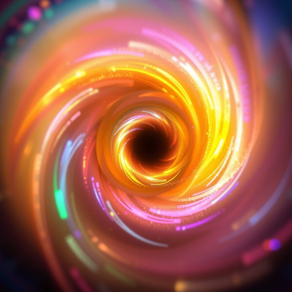 This image shows a vibrant, transparent spectral color cloud with iridescent pearlescent hues. A glowing spiral of fluorescent mist surrounds the center, which transitions from gold to white. Captured in hyperrealistic detail with cinematic lighting.