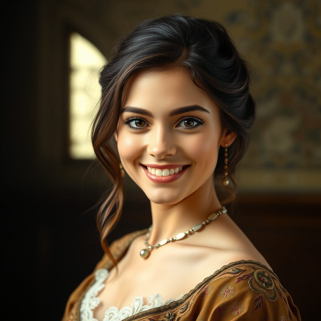 A captivating image of a smiling brunette woman in an elegant dress, bathed in soft, warm light. The portrait evokes classical artistry with intricate details.