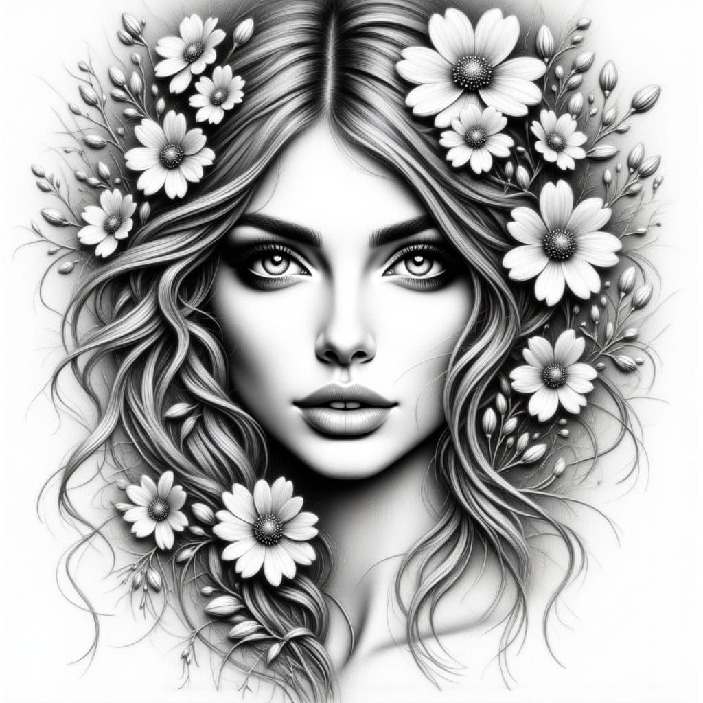 This image features a beautiful woman with long hair and intricate flowers in a detailed pencil drawing style, reminiscent of Art Nouveau and early 20th-century illustrations, with a focus on delicate textures and subtle gradients.