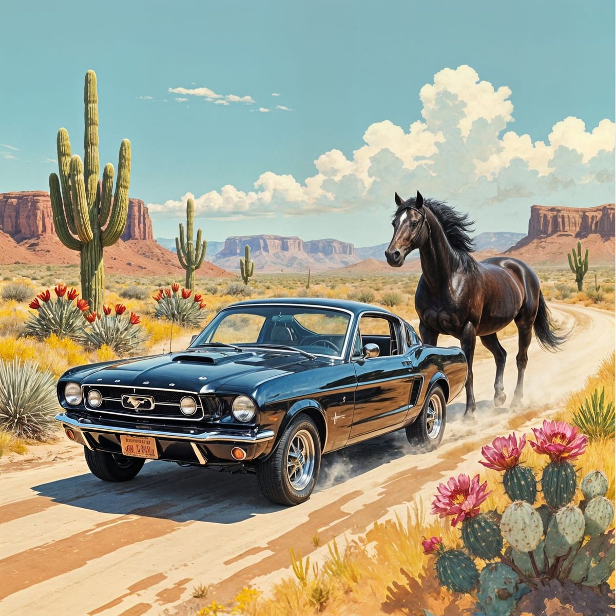 A digital rendering of a vintage black Ford Mustang alongside a black stallion racing through a desert landscape with cacti. The artwork has the appearance of gouache and watercolor on canvas.