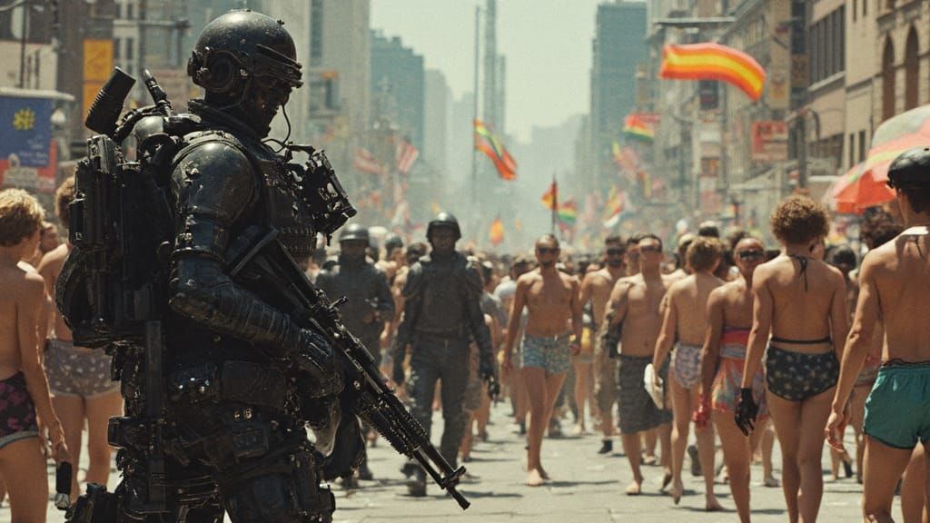This image shows a stark contrast between heavily armed cyborg soldiers and a joyful gay pride parade. The scene evokes an apocalyptic atmosphere reminiscent of classic Americana paintings.
