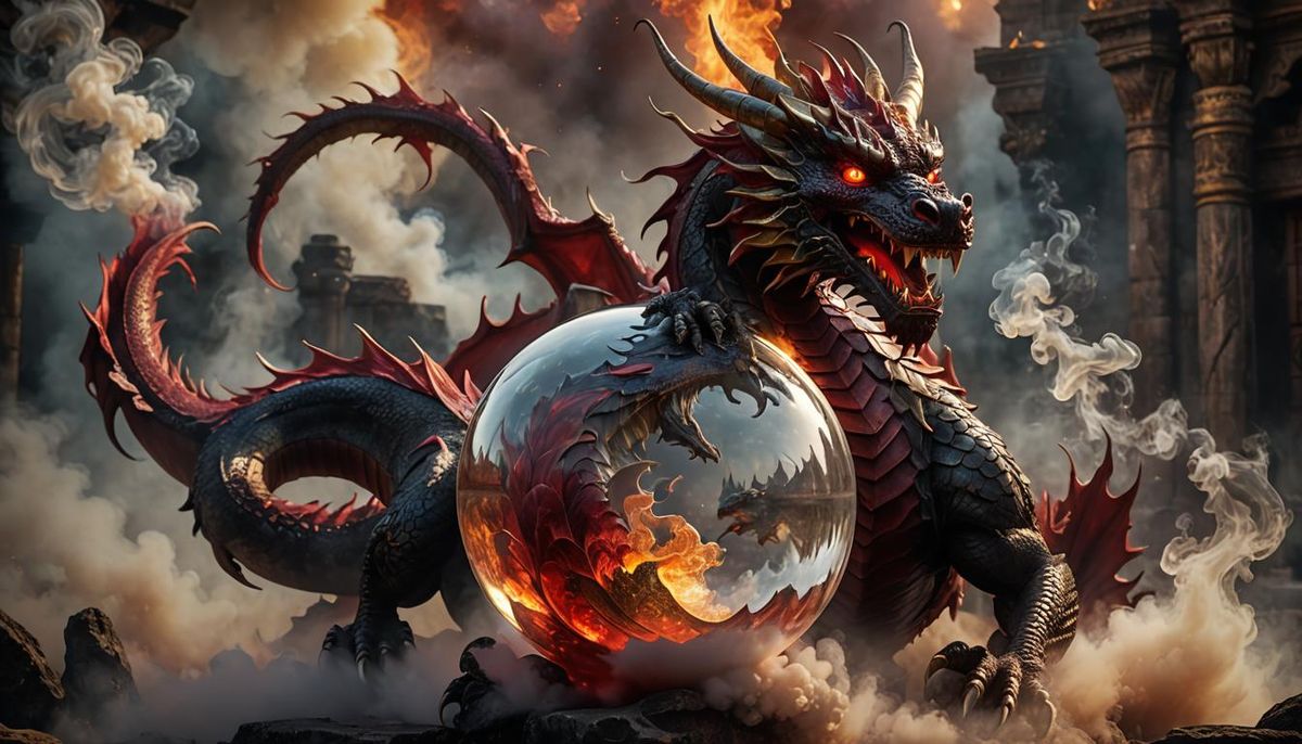 A striking picture of a dragon emerging from smoke, as seen in a crystal ball. Red and gold scales and piercing eyes capture the dragon's fierce expression in this HDR 8K image.