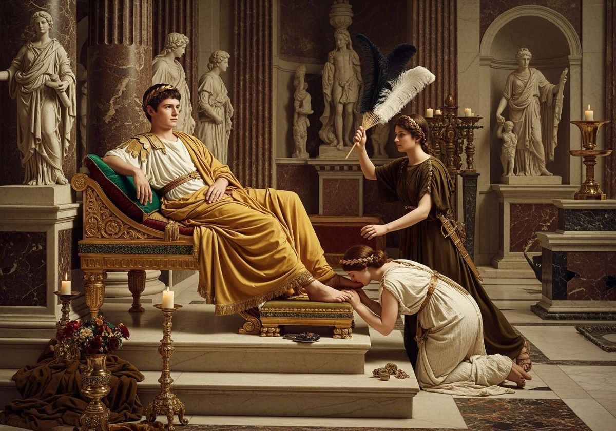 This image shows Emperor Caligula in a gold toga, relaxing barefoot on a luxurious triclinium in his palace throne room. The scene is reminiscent of classical painting, with opulent details and natural lighting.