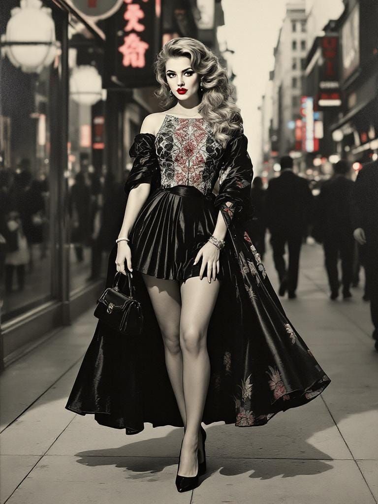 A striking picture of a 1950s Italian pin-up woman standing on a busy city sidewalk. The artwork blends geometric abstraction with dark fantasy elements, featuring structured patterns and fibrous textures.