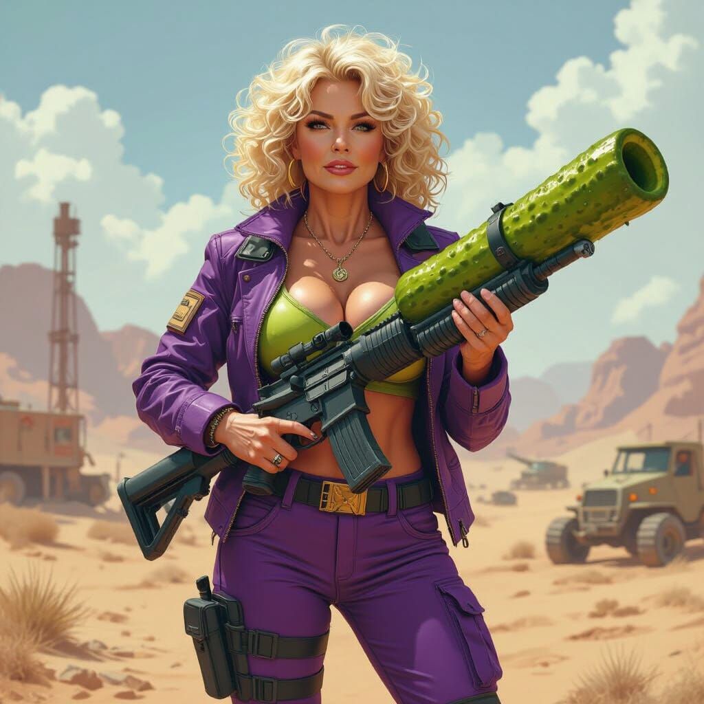 This image shows an elderly blonde woman in a desert war zone, holding a pickle-launching bazooka. She is dressed in purple combat gear, with a futuristic, vibrant aesthetic.