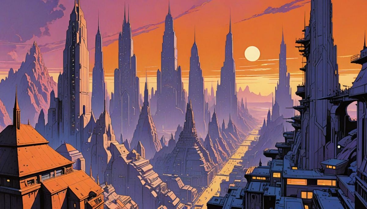 A vibrant image showcasing a futuristic city bathed in sunlight. The artwork features pastel colors with vaporwave influences in orange and purple, reminiscent of comic book art.