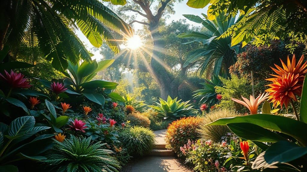This image showcases a hyperrealistic botanical garden with exotic flowers and lush foliage. Serene pathways and dappled sunlight create a tranquil, dreamlike atmosphere.