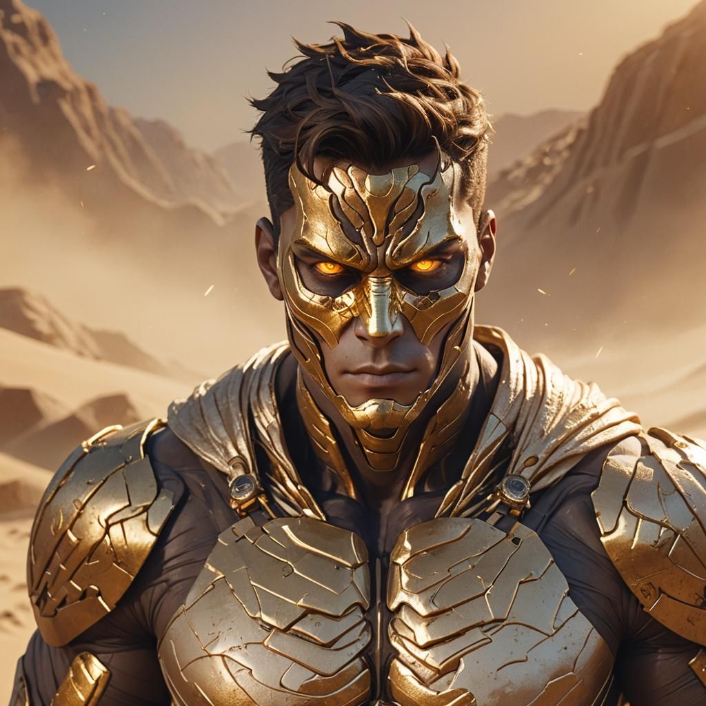 This stunning anime-inspired portrait showcases a hero with incredible sand powers, set against a warm and mystical atmosphere with soft, golden light and subtle lens flare, capturing the essence of a breathtaking concept art piece.