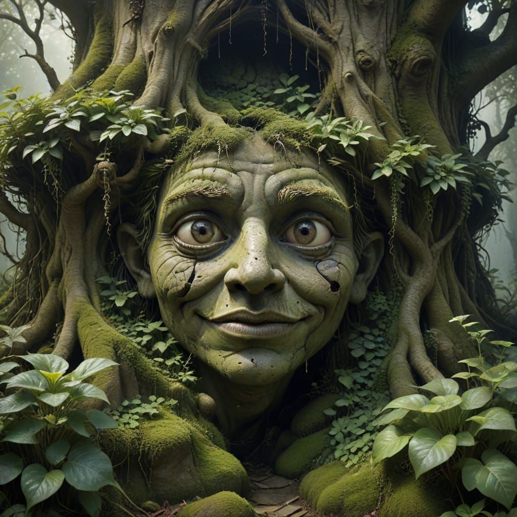 This enchanting image depicts a weathered stone wall in an ancient garden, with a whimsical face formed by cracks and crevices. Soft, diffused lighting enhances the magical atmosphere, reminiscent of fantasy concept art.