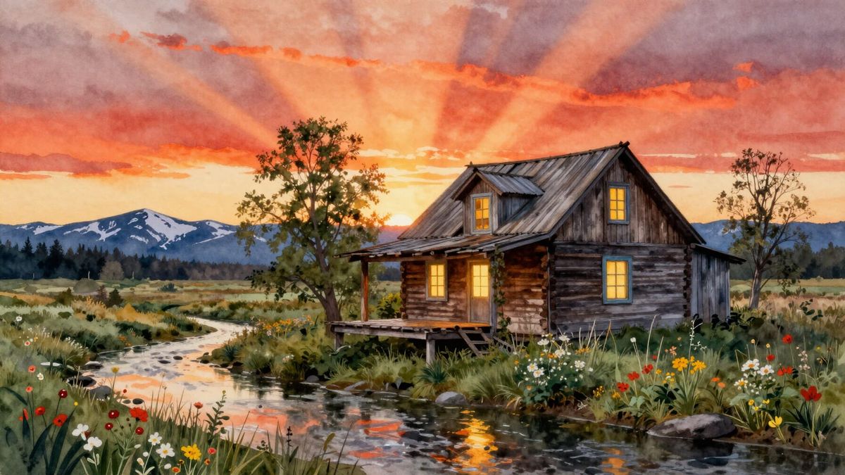 This image shows a watercolor painting of a decaying wooden house by a stream during sunset. The sky is filled with vibrant orange, red, and yellow colors, with distant snow-capped mountains visible.