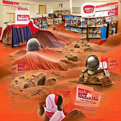 This image shows a robot selling books at a book fair on the surface of Mars. The scene is rendered in a colorful, cartoon style.
